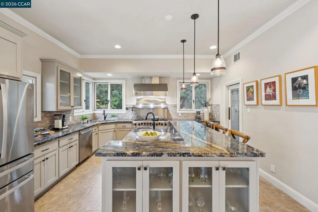 Nestled on a quiet street in Alamo’s desirable Westside, this remodeled custom home blends luxury and comfort. The stainless and granite chef’s kitchen shines with a Viking range, pantry and wine refrigerator—perfect for everyday living or entertaining. Hardwood floors, cathedral ceilings, skylights and Anderson windows add warmth and sophistication throughout 3,100+ square feet of open architecture. The main level offers effortless living with 2 bedrooms and 2 baths, including a level-in entry and a private, spacious patio. The tranquil primary retreat features a glass shower and jetted tub; a separate wing provides 2 additional bedrooms with a Jack and Jill bath. Outdoors, enjoy a serene oasis with a refinished pool, newer pavers and a lush green landscape, perfect for entertaining or relaxation. A spacious dog run with low-maintenance turf enhances functionality. Peaceful and private, this home is tucked back on a private lane backing to the Iron Horse Trail—just 0.9 miles from Murwood Elementary and near WCI and Las Lomas High, (test scores 9&10). Owned solar completes this exceptional offering at an equally exceptional value. Lowest $/F SF home.