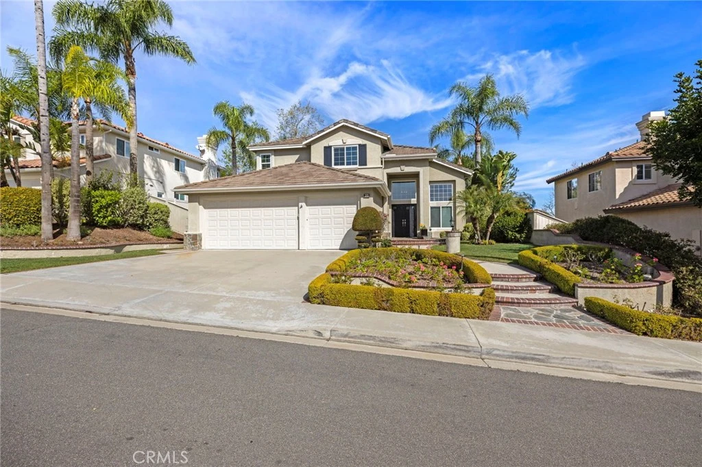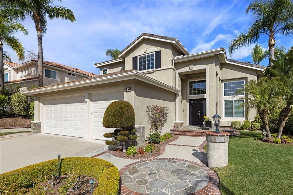 Welcome to 23 Blue Jay, framed by soaring palm trees and set beneath a bright blue sky, the home features classic architecture, a tile roof, and a spacious three-car garage. A gently curved walkway with brick accents leads to the inviting front entry, passing through a a gently curved walkway with brick accents leads manicured landscape designed by Roger’s Gardens with hedges and year round blooms. This stunning two-story entrance makes a memorable first impression with its soaring ceilings and abundant natural light. A dramatic oversized window fills the space with sunshine, highlighting the rich hardwood floors and crisp white trim throughout. A beautifully designed kitchen combines timeless elegance with everyday functionality. Custom white cabinetry extends to the ceiling and is accented with glass-front display cabinets and detailed crown molding, creating a refined, built-in look. A spacious quartz island serves as the focal point, offering generous prep space, bar seating, with designer brass fixtures. The family room has built in shelving and a marble encased fireplace along with custom detailed moldings and casings. There is one large bedroom and full bath downstairs that has designer touches throughout. Upstairs you will find 3 more large bedrooms. The primary has a beautiful view of the mountains. The primary bath has been tastefully upgraded with separate bath tub and stunning shower. The ample closet has designer built ins to accommodate the most finicky fashionistas. This backyard feels like a private resort — thoughtfully designed, beautifully landscaped, and ideal for both entertaining and quiet relaxation. A sweeping paver patio winds gracefully through lush green lawn, creating soft curves that define multiple outdoor living spaces. Mature palm trees and established landscaping frame the yard, adding height, texture, and a sense of privacy. A mix of manicured hedges, flowering shrubs, and layered plantings gives the space depth and year-round color. At the heart of the yard, a circular lounge area offers a cozy conversation setting, perfect for evening gatherings under café string lights. On the opposite side, a second intimate seating nook is tucked against raised garden beds and vibrant bougainvillea, creating a peaceful retreat surrounded by greenery. Adjacent to the home, Alumawood covered patio pergola, with remote control, provides filtered sunlight and comfortable shade. Hurry on this stunning home!