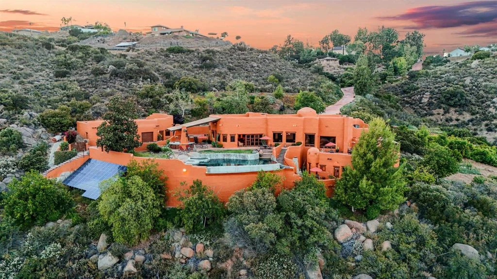 Experience the extraordinary in this custom-built Southwest Pueblo-style showplace home located in the desirable Alpine community of Rancho Palo Verde. Experience panoramic mountain and canyon views, along with resort-style outdoor spaces, sophisticated interior design, and warm, inviting Southwestern architectural details. Nestled on nine private acres, from Firebrand Drive, follow a red brick path of 100,000 hand-laid bricks into a sanctuary of peace and beauty. Enter the primary residence through a handmade front gate, where you’ll find a private courtyard featuring a custom drilled boulder water feature and a handmade James Hubbell-inspired front door. Inside, you’ll find design details, including exposed viga and latilla ceilings, Saltillo tile flooring, 10-inch-thick diamond-troweled rounded plaster adobe wall construction, as well as wood doors, windows, and cabinetry handcrafted from Honduran mahogany sourced from the forests of Belize. Every fixture and finish has been considered for its architectural integrity and artistic value, including handmade furnishings, copper window screens, 5 custom Kiva fireplaces, object niches, and custom mosaic tile work. The spectacular kitchen features a handmade island with a seated bar, crafted from sculpted concrete with a live edge, now paired with all-new kitchen appliances installed in 2025. Built for both form and function, you’ll enjoy ample workspace and thoughtful upgrades throughout. Recent improvements include new interior and exterior paint (2025), a whole-house water softener, a new "torch down" roof, and two new roof-mounted HVAC units (2025), all of which enhance comfort and efficiency. Luxuriate in four bedroom retreats, each of which features an en suite bath with custom shower and its own private balcony. Incredible outdoor spaces include multiple walled terraces, indoor/outdoor surround sound, and a one-of-a-kind, solar-heated infinity pool with a spa featuring a surface formed by over 10,000 hand-laid two-inch river rocks. Enjoy the peace of mind offered by self-sustaining features, including a private well, fully mature fruit trees, and a newly upgraded 24 kW ground-mounted solar system—an upgrade from the original 14 kW system. For the automotive enthusiast, there’s a two-car garage attached along with an additional three-car detached garage. This space includes additional living quarters for guests or for multi-generational households. Enjoy the privacy and serenity of a remote estate property while living just minutes from town. Not just a home—it's a masterpiece you live in.
