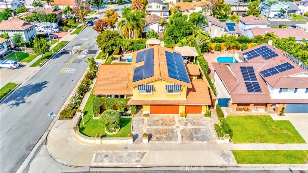 Spectacular luxury living in the prestigious city of Anaheim Hills! Charming corner-lot pool home in a prime location with an entertainer’s dream backyard. Welcome to your Tuscan-inspired sanctuary, a stunning outdoor paradise with a sparkling pool & spa, custom hardscape, elevated lounging & dining areas, and a peaceful koi pond. Enjoy gatherings under string lights, dine on the terrace, relax by the fire pit, or unwind beneath the stars. This entertainer’s haven features a fully equipped outdoor kitchen with built-in BBQ, stove, dishwasher & refrigerator, plus a covered California room with dual ceiling fans, fireplace & stamped stone pathways. Every space is designed for relaxation & everyday luxury. This spacious home offers 4 bedrooms, 3.5 baths & approx. 3,042 sq. ft. on an 8,165 sq. ft. lot. The main floor includes a large living room with fireplace, wet bar & sliding doors for indoor/outdoor flow, along with a convenient bedroom, full bath & guest powder room. Up a few steps is the impressive kitchen with granite countertops, built-in 5-burner range & hood, dishwasher, abundant cabinetry & a generous center island open to the dining & family rooms. The primary suite offers an oversized walk-in closet with custom built-ins, projector screen with surround sound & a beautifully remodeled ensuite bath with dual sinks, vanity & large walk-in shower. Two additional bedrooms share an updated hallway bath with dual sinks & shower-in-tub combo. Recent upgrades include a remodeled downstairs bath, new decorative panels in the first-floor closet, replacement of all faucets, plumbing fixtures, drains & toilets throughout (including the kitchen), partial cabinet refinishing & new wood flooring in the second-floor walk-in closet. The backyard electrical system was rewired, outlets replaced & a new microwave and dishwasher installed in 2025. Original upgrades include new central A/C (2018) & FULLY OWNED solar panels. Other highlights include a newer furnace, tankless water heater, Venetian plaster walls, recessed lighting, and wood/travertine flooring. This home radiates charm, character & pride of ownership. Centrally located near top-rated schools, shopping, dining, parks, hiking trails & entertainment with easy 91 freeway access in a wonderful neighborhood of long-time residents. Don’t miss this rare opportunity to own one of Anaheim Hills’ most captivating homes!