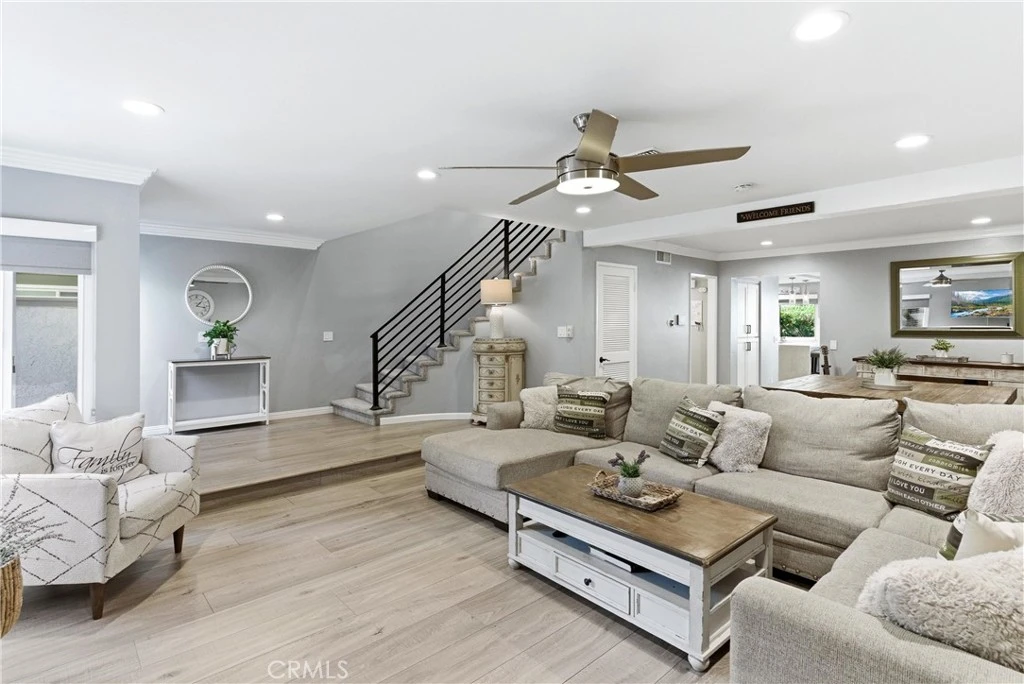 Open, light-filled living in Anaheim Hills’ Galerie community! This beautiful home has an exceptionally spacious 3-bedroom floor plan, with over 2,136 square feet and multiple outdoor living areas to enjoy. A 2-car garage and a gated entryway welcome you through a private patio courtyard before you step inside. The double-height foyer opens to dramatic curved stairs and luxury vinyl plank flooring that runs throughout the main level. The first living area features a fireplace and flows into your dining space, all with recessed lighting above. The family room and kitchen share an open layout that connects to one of the home’s best features: an expansive covered patio with sliding glass doors, overlooking the landscaped greenery of the community. The updated kitchen is finished with quartz countertops featuring a waterfall edge, bar seating for casual meals, and upgraded stainless steel appliances. A powder bath and dedicated laundry room round out the first floor. Upstairs, all three bedrooms are on the same level, each with carpet, ceiling fans, and recessed lighting. The primary suite is a retreat unto itself, with a huge bedroom area and an airy vaulted ceiling, sliding doors to a private terrace, plus a generous walk-in closet. The en-suite primary bath has a double-sink vanity and a soaking tub with shower. Two secondary bedrooms offer good natural light and storage, sharing a full hall bath. Galerie is a peaceful, well-maintained community with a clubhouse, pool and spa. Top-rated Anaheim Hills schools, Oak Canyon Nature Center and trails, Anaheim Hills Golf Club, and diverse local dining and shops are all close by. A rare combination of space, privacy, and community.