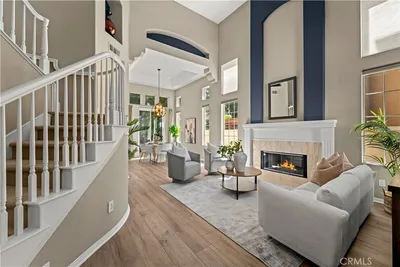 Welcome to this beautifully maintained 5 bedroom, 3 bathroom home offering approximately 2,900 square feet of living space in one of Anaheim Hills’ desirable neighborhoods. With soaring ceilings, abundant natural light, and multiple living and entertaining spaces, this home offers the ideal combination of comfort, functionality, and location. Enter through double doors into an impressive foyer with sweeping staircase. To the right is the formal living room with fireplace and adjacent formal dining room with sliding doors leading to the backyard, creating an inviting space for gatherings. Luxury vinyl flooring enhances the main living areas. Just off the entry is a private office that can easily serve as a fifth bedroom, ideal for guests or working from home. The spacious family room features a fireplace, wet bar, surround sound speakers, and flows seamlessly into the breakfast nook and kitchen, making it the heart of the home. The kitchen is designed for both everyday living and entertaining, featuring a center island with 5-burner cooktop and breakfast bar seating, along with three ovens, microwave, dishwasher, trash compactor, refrigerator, walk-in pantry, and recessed lighting. The main floor also includes a ¾ bathroom and laundry room with sink. Upstairs, the primary suite is a true retreat, entered through double doors and offering an oversized bedroom with sitting area, dual-sided fireplace, ceiling fan, walk-in closet with built-ins, and access to a private deck. The remodeled primary bathroom features dual sinks, updated cabinetry, soaking jacuzzi tub, and a large walk-in shower with dual shower heads. Three additional upstairs bedrooms are generously sized, with one offering flexibility as a bonus room, all with ceiling fans. Step outside to a private backyard perfect for relaxing or entertaining, complete with patio, built-in BBQ, grassy area, mature landscaping, and hillside backdrop providing added privacy. Additional features include 3-car garage, EV charger, tankless water heater, whole house fan, and one recently replaced HVAC system and freshly painted exterior. Ideally located near award-winning schools, neighborhood parks, scenic hiking and biking trails, shopping, dining, and with convenient freeway access, this home offers the best of Anaheim Hills living.