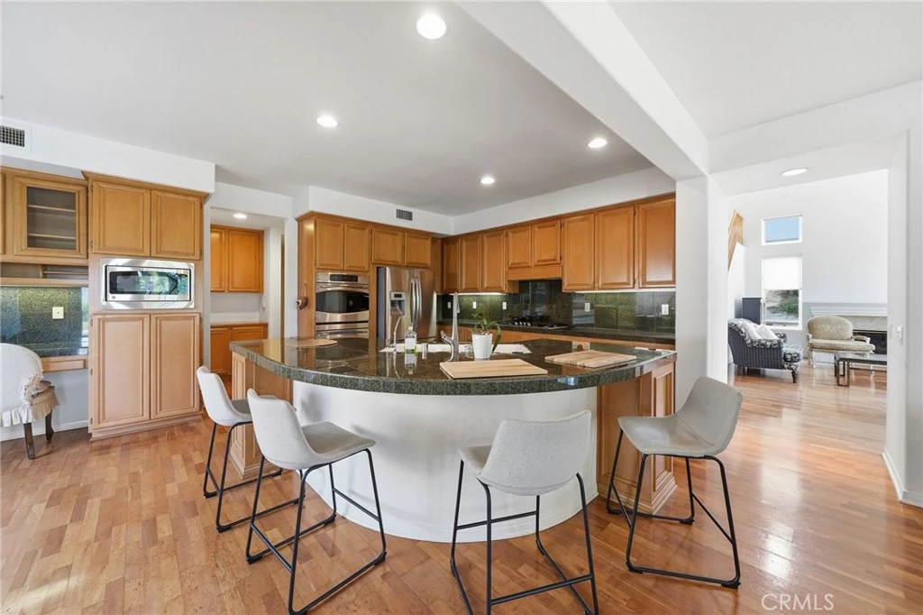 VIEW! VIEW! VIEW! Stunning canyon and city views from this beautifully upgraded executive home perched high in the Summit Springs community of Anaheim Hills. This exceptional residence features a fantastic floor plan with a spacious formal living room showcasing rich wood flooring and elegant custom touches throughout. The open-concept family room flows seamlessly into the gourmet kitchen, complete with granite countertops, stainless steel appliances, a large center island, and an additional dining area—perfect for entertaining. The home offers hardwood flooring throughout the downstairs and soft, neutral carpeting upstairs. One upstairs bedroom has been thoughtfully converted into a versatile bonus room with a study area. A convenient downstairs bedroom is ideal for guests or multi-generational living. The primary suite boasts breathtaking panoramic views of the city and surrounding hills. Step outside to a beautifully designed backyard with extensive hardscaping and a built-in barbecue—perfect for enjoying Southern California living. Pride of ownership shines throughout this well-maintained home. Located near award-winning schools and close to shopping, dining, and amenities. Don’t miss this incredible opportunity!