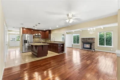 This beautifully upgraded and thoughtfully designed five bedroom, three bathroom home where comfort, space, and function come together seamlessly. Double entry doors create an inviting first impression, and inside you will find a timeless blend of travertine tile, rich hardwood flooring, upgraded 5 inch baseboards, raised panel doors, recessed lighting, and custom paint. Vaulted ceilings with beam accents and two skylights bring in abundant natural light and create an open, airy feel throughout. The kitchen is the heart of the home, featuring a large center island with a sit up counter, granite countertops and slab backsplash, stainless steel appliances, pendant lighting and updated warm wood cabinetry. Just off the kitchen, a formal dining area offers an inviting setting for gatherings, while the adjacent family room adds even more space to relax, anchored by the second of two fireplaces and an elegant chandelier that elevates the room. Off the family room is a bonus media room, home office, or exercise room with sliding door access to the spacious side yard, adding another layer of versatility and space. This home offers a flexible layout with five bedrooms including two true primary bedrooms, ideal for multi generational living, guests, or a private work from home setup. The converted living area functions as an additional bedroom with a fireplace and direct access to an ensuite bathroom with a walk in shower. One bedroom also features a built in desk, perfect for homework, crafts, or a home workstation. The first primary bedroom offers ample closet space, including 8 foot mirrored closet doors and a bonus double door spaced second closet. The second primary suite is huge, with double door 8 foot high mirrored doors and an additional space where another closet could be added if desired plus a sliding door to the tranquil backyard. Practical details continue with washer and dryer hookups in a dedicated space and the direct access 2 car garage, plus extra garage storage for tools, gear, and seasonal items. Major upgrades include dual pane windows, a newer roof, water heater, HVAC, and a paid off Tesla solar system with a battery pack for long term efficiency. Ideally located next door to Glenview Elementary School and down the street from Esperanza High School, with quick freeway access and minutes to shopping, dining, and entertainment, this home delivers the space you want and the lifestyle you need.