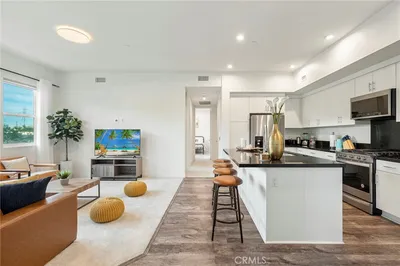 Located within the desirable, gated 100 West community built by renowned builder Toll Brothers is a four story home that boasts modern designs. First level consists of a downstairs bedroom and bathroom. Main level holds the open concept living area. Kitchen is complete with gorgeous white cabinetry and center island. Two patios on the main level allow for an enhanced indoor/outdoor flow. Third level features the luxurious master suite as well as remaining bedrooms. Windows throughout allow for sunlight to pour in, bringing in a plethora of natural lighting. Residing on the upmost level is a roof top deck that is perfect for entertaining guests. Additional highlights include two car garage, gated community, and many more. Centrally located within the heart of Orange County, this home is minutes away from Disneyland, Angels Stadium, Honda Center, shopping, and dining. This home allows for the lively Anaheim lifestyle, all while offering both comfort and convenience.