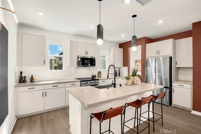 Built in 2019, this beautifully designed three-level townhome blends modern style with warm, inviting spaces that feel instantly like home. Thoughtfully laid out for both comfortable living and effortless entertaining, every level offers something special. The main living floor welcomes you with a bright, open-concept layout where the living room, dining area, and kitchen come together in a seamless space filled with natural light. The kitchen is a true centerpiece, featuring crisp quartz countertops, sleek self-closing cabinetry, and an oversized island perfect for gathering with friends, hosting dinners, or enjoying your morning coffee. The clean, all-white design gives the space a timeless, fresh feel that pairs beautifully with the durable vinyl flooring that runs throughout the home. Upstairs, the generous primary suite feels like a peaceful retreat, offering a spacious walk-in closet, expansive dual vanity, walk-in shower with beautiful designer tile flooring, and a private toilet room for added comfort. The 2nd bedroom completes the upper level, with ample space and an en-suite bathroom, making it perfect for visitors or multigenerational living. The first level offers a private work-from-home office space, ideal for remote work, a reading nook, or a creative studio. Just steps away is the attached two-car garage with well-maintained concrete flooring, providing both convenience and a polished finish. Central heating and air conditioning keep the home comfortable year-round. Outside your door, the community offers inviting shared spaces including a sparkling pool, BBQ area, and a children’s playground, creating the perfect setting for relaxing weekends and neighborhood gatherings. With easy freeway access and close proximity to shopping, dining, and everyday conveniences, the location makes daily life simple and connected. Stylish, welcoming, and designed for modern living, this home offers comfort, character, and the perfect place to entertain.