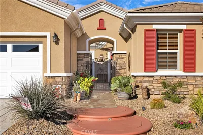 Welcome home to this stunning Magnolia model located on the golf course in the highly sought-after 55+ community of Sun City by Del Webb in Apple Valley. Enjoy breathtaking views of the fairway and surrounding mountains from this beautifully upgraded home filled with character and country charm. Inside, you'll find wood flooring throughout, offering both durability and easy maintenance. The kitchen is the heart of the home, and features upgraded granite countertops, a custom copper sink with a modern faucet, stainless steel appliances, unique pendant lighting, and wood-toned plantation shutters(throughout). The open layout makes it perfect for everyday living and entertaining. This split floor plan offers privacy and functionality. The oversized primary suite enjoys golf-course views and includes a spacious ensuite bathroom with a dual-sink vanity, soaking tub, walk-in shower, private water closet, and large walk-in closet. On the opposite side of the home, you'll find a flex room/den that can easily serve as an office, craft room, or potential third bedroom, along with a spacious secondary bedroom with a walk-in closet. The living room is warm and inviting, highlighted by a distinctive copper-and-alder-wood fireplace with a raised hearth and built-in sconce lighting, creating the perfect cozy gathering space. The private front courtyard is ideal for al fresco dining and truly feels like an extension of the kitchen—perfect for hosting family and friends. Relax on the covered backyard patio while enjoying golf course views. The professionally sealed flagstone surface and low-maintenance planters with drip irrigation create an outdoor space that is both beautiful and easy to care for. Some of the additional upgrades include a custom-finished garage with built-in storage and custom interior paint. Bonus... on the sides of the home, you have a dog run with wrought-iron fencing and a small storage shed. With many more thoughtful upgrades throughout, this home is truly a must-see to appreciate everything it offers. Located in the vibrant Sun City Del Webb community, residents enjoy two clubhouses, pools, golf, and numerous amenities. Conveniently situated near shopping, dining, entertainment, and medical facilities. Come experience the views and charm of this exceptional golf course home.