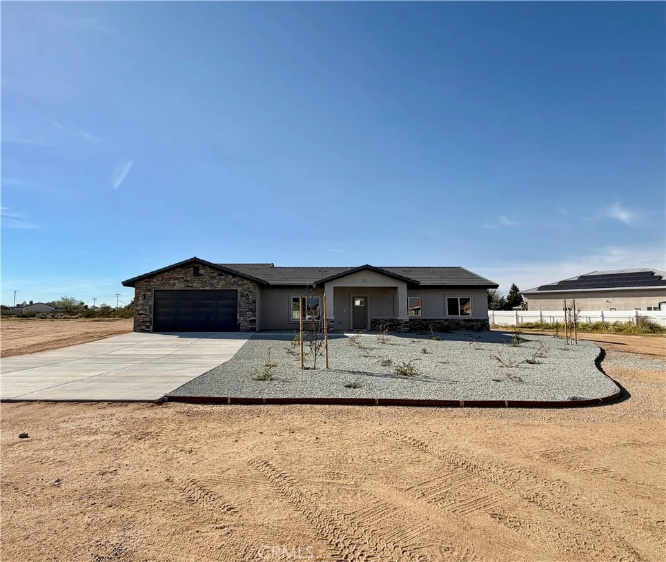 Brand-new construction on 1.1 acres with beautiful desert and mountain views! This 1,857 sq ft home features 4 bedrooms, 2 bathrooms, and a split floor plan for added privacy. Enjoy peaked ceilings, concrete floors, and quartz countertops throughout. The spacious primary suite offers a walk-in closet and a separate tub and shower. Includes paid solar with battery, landscaped front yard, and a 2-car garage. Conveniently located near schools and shopping—perfect for comfortable desert living!