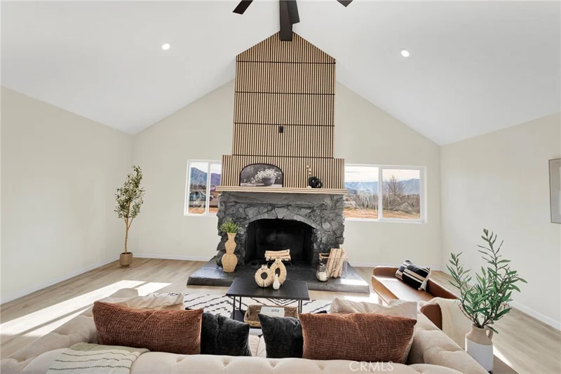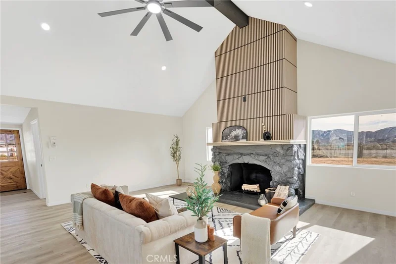 DESERT MODERN meets 1.25 ACRES of opportunity. This FULLY REMODELED 4-Bed, 2-Bath home showcases an OPEN, AIRY FLOOR PLAN with NEW WINDOWS, UPDATED FLOORING, and a stunning STATEMENT FIREPLACE with custom detailing, plus a SECOND FIREPLACE for added ambiance. The DESIGNER KITCHEN features new sleek cabinetry, new STAINLESS STEEL APPLIANCES, a spacious ISLAND, and a fun BACKSPLASH that adds the perfect pop of personality & modern edge. Both BATHROOMS are FULLY REMODELED with clean, contemporary finishes. Outside, enjoy endless potential with TWO DETACHED GARAGES ideal for storage, hobbies, or your desert lifestyle. MOVE-IN READY. MODERN and Unique