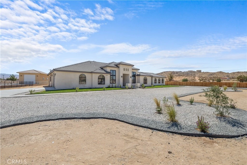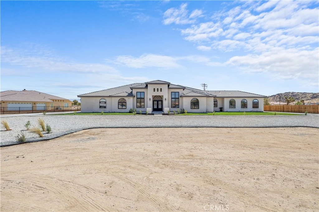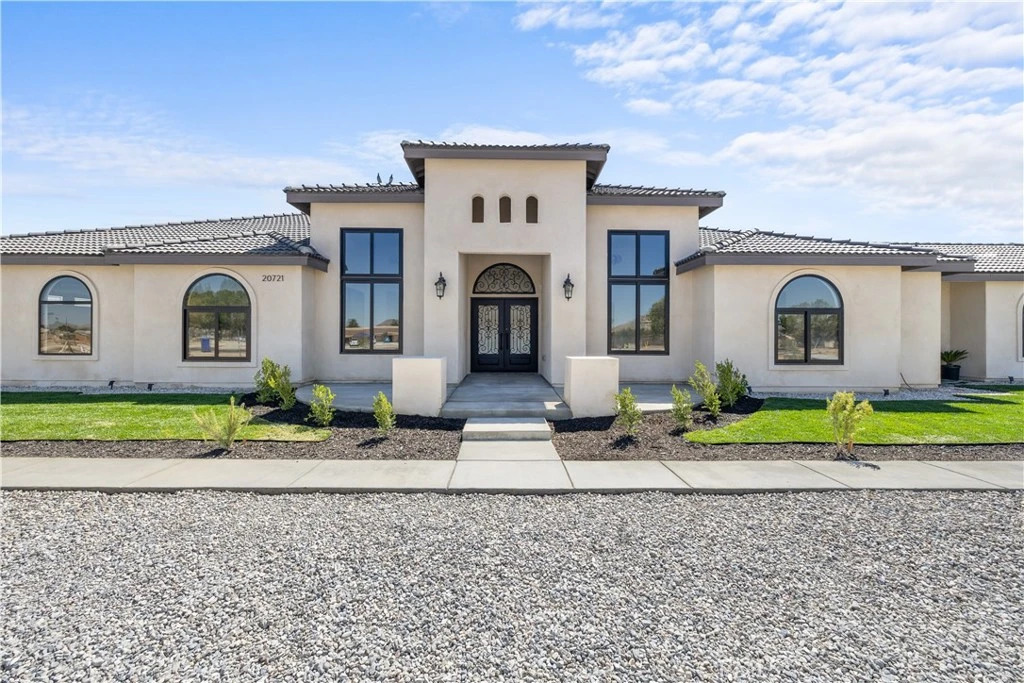 Welcome to 20721 Standing Rock Avenue. This BRAND NEW custom-built residence offers an impressive 3,404 square feet of sophisticated and comfortable living space, showcasing 5 spacious bedrooms, two of them being full bedroom suites, and 4 generously sized full bathrooms. A grand entry with double wrought-iron doors welcomes you to a flawless open floor plan with soaring 13ft and 11ft ceilings throughout the home allowing abundance of natural light. The modern kitchen is truly a chef's delight with two oversized islands with marble countertops ideal for meal preparation or family gatherings. Custom full cherry wood frame fitting cabinets with soft closing glassed faced doors and dovetail drawers are a hallmark of luxury craftsmanship in this home. Fully equipped with stainless steel high-end Thor appliances featuring a 48 inch six-burner range and matching hood, this chef-inspired kitchen is both stylish and functional. A spacious walk-in pantry offers generous storage. Elegant custom chandeliers as well as recessed lighting illuminate the arched hallways that lead to the bedrooms. As you enter the double doors to the primary suite you’ll find a peaceful retreat with its very own private patio, a spa-inspired bath including an impressive shower, freestanding jet tub, dual vanities and his and her walk-in closets. The interior of this home showcases many upgraded details such as the 8ft solid wood doors throughout and the smoked glass sliding closet doors in the bedrooms. A stand out feature in this home are the large black aluminum, double pane, argon filled insulated, 5 inch framed windows that open and lock automatically from either side with sliding heavy-duty screen. With an oversized, fully fenced back yard you get RV access and endless possibilities to fit your needs. Two immense full concrete driveways lead to a two car garage on both ends of the house, giving you a total of 4 car garage spaces. Both garages are fully finished and feature recessed lighting. This home is equipped with two full AC units and paid off solar! Situated in a prime estate location with paved roads this residence is centrally located within walking distance to shopping, restaurants, community park swimming pool, police and fire station. Nearby shops include Target, Walmart, Albertsons, Ross, amongst many familiar restaurants and the public Apple Valley Golf Course. Great neighborhood and neighbors. Don't miss the opportunity to make this exquisite property your own!
