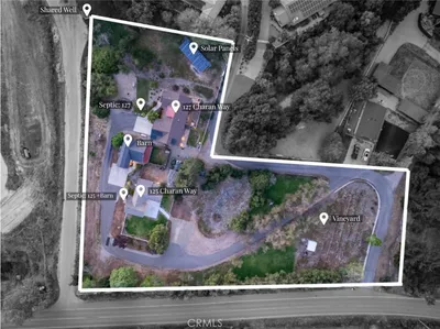 Over $200,000 invested in recent property improvements, including complete interior painting throughout the main house, new flooring in primary living areas, and electrical upgrades. From the gated entrance, fragrant landscaping with succulents, sage, palm trees, and citrus trees creates a warm welcome. Unique hardscape features and a circular driveway center the home within the property, creating a striking arrival. Stained-glass entry doors open to an inviting interior that flows from the dining room to the kitchen and laundry area. The laundry room conveniently connects to both the kitchen and the back porch. The spacious kitchen features tile countertops, modern appliances, abundant cabinetry, and a wet bar with additional storage. A breakfast bar offers extra seating and workspace. The kitchen opens to a dining area with beautiful property views, copper ceiling tiles, and access to the back porch. A charming under-stair storage nook adds functionality. Soaring wood-beamed ceilings bring warmth and natural light throughout the home. A short flight of stairs leads to the primary living room, where expansive windows frame sweeping views of rolling hills and surrounding landscape. Decorative mural artwork adds character, and the room opens to a scenic balcony. Two bedrooms are located just off the living room, both with balcony access. The nearby bathroom includes a dual-sink vanity and a shower/tub with tile surround. Up another short flight of stairs is the private primary suite featuring skylights, a sitting area, and sweeping views stretching all the way to the ocean. The ensuite bath offers a dual-sink vanity, soaking tub, walk-in tile shower, walk-in closet, and private balcony. The converted basement offers a separate two-bedroom, one-bath living space with its own private entrance and laundry—ideal for guests, extended family, or rental potential. Additional features include a pole barn, saloon building, detached three-car garage with mechanic pit, a private well with 500-gallon galvanized steel holding tank, a windmill, and panoramic views. Plus a bonus room above the garage. This unique property offers versatile living spaces, open field views from every window, and endless possibilities in a beautiful scenic setting.