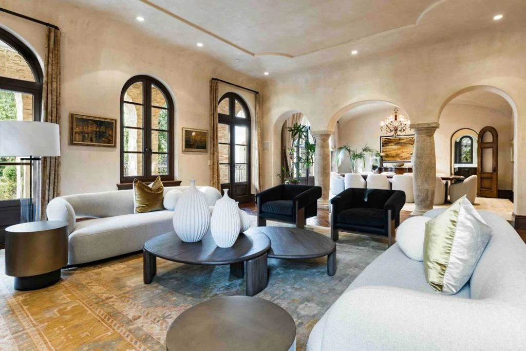 Set on a quiet cul-de-sac in the Circus Club neighborhood, this exceptional estate draws inspiration from Italian villas. Mahogany gates open to rare materials and meticulous craftsmanship, including antique French roof tiles, hand-carved limestone, and solid stone exterior. The estate totals more than 12,000 square feet, with hand-scraped beams, walnut floors, detailed ceilings, and hand-plastered walls creating warm, timeless spaces. The home features formal living and dining rooms, a paneled study, Calacatta Oro kitchen, integrated Crestron automation, Lutron lighting, and distributed audio. Three elevator-served levels include six bedrooms, a primary suite with spa-like bath, a 1,500-bottle wine cellar, state-of-the-art theater, and lounge with full bar. Retractable glass walls lead to grounds with a guest house, covered dining terrace, pizza oven, outdoor kitchen, and saltwater pool and spa.
