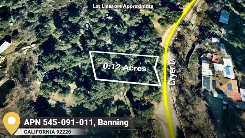 APN 545-091-011 is vacant land in Banning with 0.12 acres. The undeveloped land is zoned CBOOK. This parcel does not have a street address and Cryer Dr is listed as a reference.