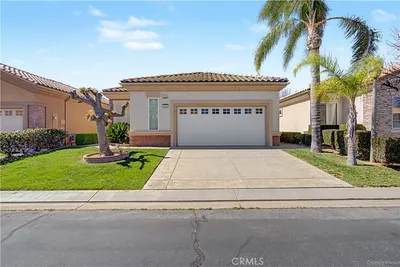 Just imagine yourself with your favorite beverage and setting back and enjoy the view of the golf course from your back patio – taking in this beautiful view and enjoy the conversation you might have with your neighbors and friends. When you’re finished relaxing, come and play the 18-hole professional course here at Sun Lakes and partake in the enjoyment of playing on a well maintained and picturesque golf course. If this course seems to be challenging – then play the Executive 18-hole golf course that offers similar breathtaking views and challenges. If golf isn’t your bag – then how about playing tennis on the renovated tennis courts near the South Club house. If tennis isn’t your interest, how about playing pickleball on the renovated pickleball courts near the North Club house. If tennis or pickleball isn’t your cup of tea – try relaxing at the large pool and spas located at the main club house, north club house, or the in-door pool and spa at the South Club house. There’s a saying here at Sun Lakes Country Club – if you’re bored, it’s your fault” because if you have a interest, there probably is a club you can join. Having tried out the different facilities – ranging from golf, tennis, pickleball, bocce ball, weight rooms, hobby rooms, entertainment center, exquisite on-site restaurant and sand wedge sandwich shop, and now you need to relax – This 2 bedrooms, Den/bedroom/bonus room and 2 1/2 bath can be called your home This home has professionally installed plantation shutters, ceiling fans throughout, and white cabinets, newer water heater. The back yard has a full-length covered patio with outdoor fan and has a great view of the golf course and can be used for relaxation or entertaining your friends and family. This model has a 2-car expanded garage (for your golf cart storage). Even more exciting, Sun Lakes doesn’t have any Melo Ross as does all new construction in Banning and Beaumont areas!
