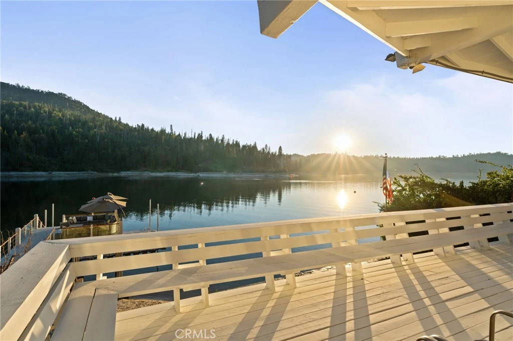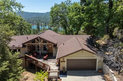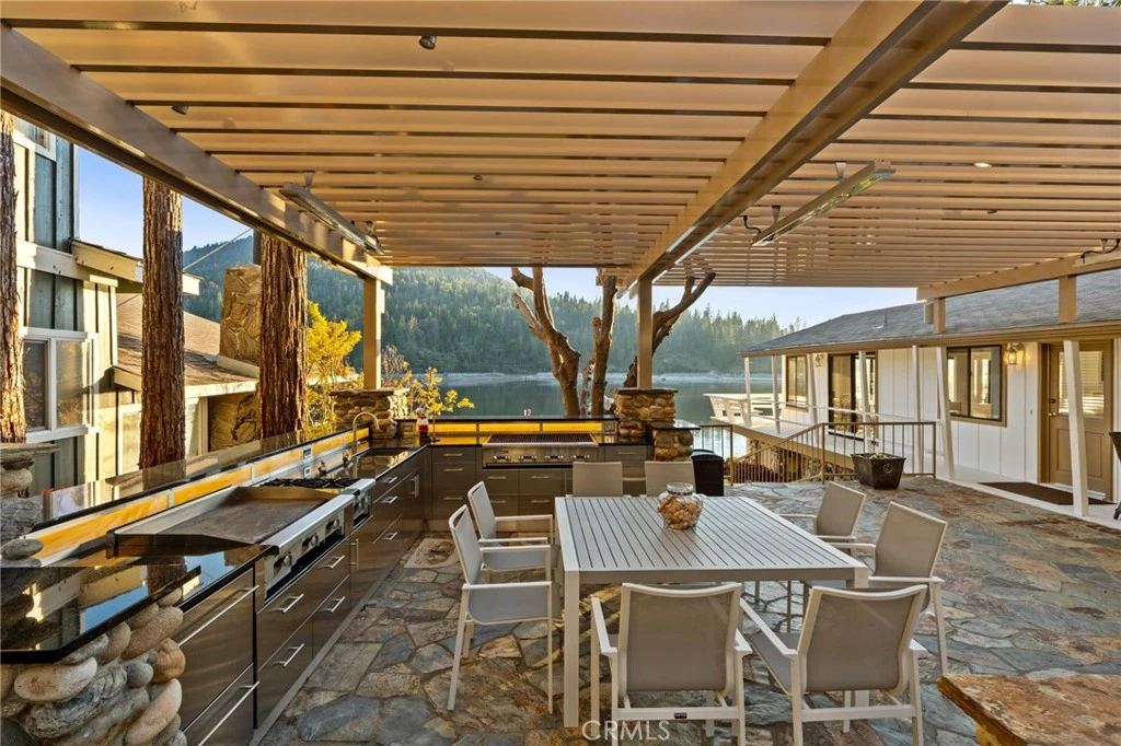 Experience Bass Lake living with this exceptional legacy estate, a rare waterfront offering that combines two homes on a gated parcel, a massive and newer private dock, and is located just a short distance to The Pines. Tucked away at the end of the road, for unmatched privacy, this property represents a generational opportunity on one of the most coveted stretches of the shoreline. Bass Lake, known for its glassy morning waters and proximity to Yosemite National Park, it is a destination where family traditions take root and summer memories are made. The main residence serves as the sophisticated heart of the compound, featuring four bedrooms and two bathrooms. The interior design is defined by a seamless blend of comfort and elegance, highlighted by granite countertops in the kitchen and matching granite surrounds on the wood-burning fireplaces in both the family room and the primary suite. Expansive windows throughout the home act as natural frames for the breathtaking views of the water and the emerald-green hillsides. This home is designed to pull the beauty of the outdoors inside, ensuring the lake is a constant presence in your daily life. Outdoor living is elevated to an art form here, centered around a massive wraparound deck that functions as a premier open-air lounge. The fully equipped outdoor kitchen is a chef’s dream, featuring a built-in BBQ, cooktop, grill, granite counters and sheltered by a custom pergola with integrated heating and lighting and custom built-in seating. From this vantage point, you can look down upon your private dock, which offers a rare level of utility with multiple boat tie-ups and dedicated space for up to six jet skis, along with a massive sunbathing deck. Whether you are hosting a large summer gathering or watching the annual fireworks display directly from your own dock or patio, the setting is truly coveted. The second residence provides incredible flexibility, offering two bedrooms, a full bathroom, and a sprawling game room with its own half-bath. This additional structure ensures that even with a full house, everyone has space to retreat and relax. Supporting the lifestyle is a substantial detached garage, currently reimagined as a high-end home gym and a separate storage area specifically designed for lake toys and equipment. This one-of-a-kind retreat offers the privacy of a gated end-of-the-road location and the versatility of a true family compound, making it the premier waterfront legacy on the lake.
