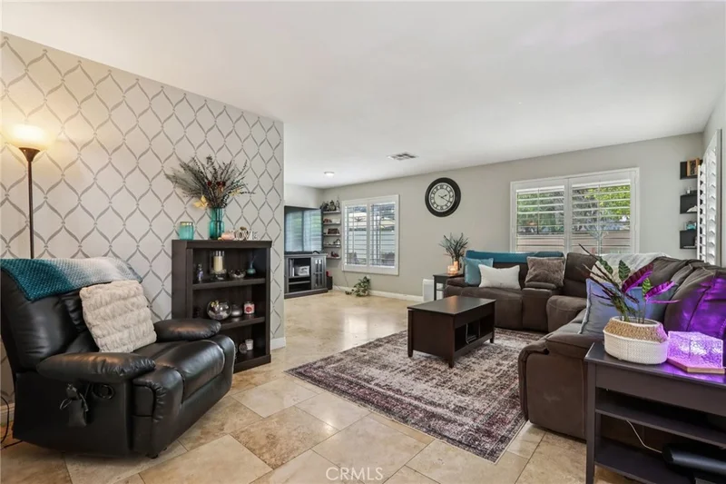 Welcome to this beautifully maintained home in a desirable location. A charming front patio creates a warm and inviting entry, setting the tone for the thoughtful design found throughout the home. Inside, you’ll find a generously sized downstairs bedroom and a full bathroom with a walk-in shower—ideal for guests, multigenerational living, or a private home office. The kitchen features stainless steel appliances, a full backsplash, pantry, and a center island with seating, perfect for casual dining or entertaining. Wide-plank laminate flooring enhances the staircase and bedrooms, while durable tile flooring runs throughout the downstairs living areas and wet spaces. Upstairs, the convenient laundry room includes upper cabinetry, a hanging rod, and shelving for added organization. The spacious primary suite offers a private deck overlooking the backyard, creating a peaceful retreat to enjoy morning coffee or evening relaxation. Outside, the expansive backyard features a large concrete patio, lush green grass, and mature trees—ideal for gatherings or quiet outdoor living. Additional upgrades include owned solar panels, a whole-house water softener system, water filtration in kitchen, Nest thermostat, Ring doorbell, and plantation shutters throughout. Conveniently located within walking distance of Fallen Heroes Park, just around the corner from Oak Valley Golf Club, and offering easy access to Interstate 10, this home combines modern amenities with a prime location.