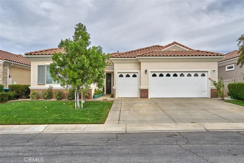 Popular Emerald model in Solera, a gated 55+ community, with mountain views and no rear neighbors. Nicely landscaped front and back yards. Solar with a low $91 monthly payment and a newer water softener system. The home features a gas fireplace in the living room, two and a half baths, and two bedrooms plus a versatile third den or office. Large walk-in closets in the bedrooms. The primary suite includes a walk-in shower and jetted bathtub. A front security screen door and screened back door allow for natural airflow. Ceiling fans throughout. Pendant lighting in the kitchen. The garage includes a dedicated golf cart space or just additional storage. All appliances are included. Solera amenities include a pool, spa, clubhouse, indoor gym and walking track, tennis courts, billiards, bocce ball, library, classes, clubs, group trips, and 24-hour security. Basic Spectrum cable and internet are included with the HOA. Convenient access to Palm Springs, Redlands, Oak Glen, Cabazon Outlets, Morongo Casino, golf courses, and nearby freeway access.