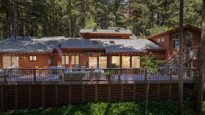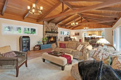 Welcome to 135 Indian Springs Drive, an elegant and private luxury home. Set at the end of a quiet cul-de-sac, this refined residence offers beautiful views of mature oak trees, a terraced yard, and exceptional indoor-outdoor flow for entertaining. The main living area features soaring wood ceilings, large windows, skylights, and a dramatic stone fireplace. The chefs kitchen boasts custom wood cabinetry, dual ovens, gas cooktop, wine fridge, pantry cabinet, and abundant counter space. The floor plan includes two bedrooms and 1.5 baths in one wing, while the private primary suite occupies its own wing with two walk-in closets and a spa-like bath with soaking tub, dual-head shower, and direct hot tub access. Downstairs, a spacious family room adds versatility. Systems include natural gas, city water, multi-zone HVAC (2017), solar panels with Enphase 10kWh battery, central vacuum, plus a premium new roof and gutters (2026). A 3-car garage, large driveway, RV/boat parking, and fruit trees complete this rare offering.