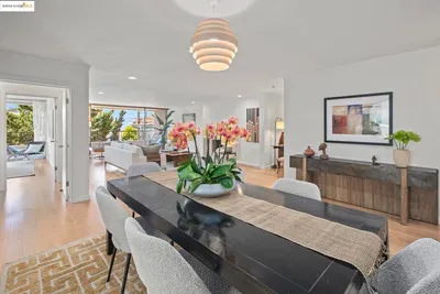 Experience luxurious, all-level living in one of Berkeley's most coveted locations. This expansive Mid-century residence offers a sophisticated retreat in the heart of walkable North Berkeley, just steps from the famed Gourmet Ghetto. As one of only two units with a private garden, it is professionally landscaped featuring two soothing water features and offers a truly serene environment. Situated on the quiet, garden-facing side of a rare elevator building, this unit has two spacious bedrooms—including a primary suite—and two bathrooms. The home is anchored by an exceptional eat-in kitchen featuring exquisite cabinetry, stone counters, intricate tile work and high-end appliances. This culinary heart opens to a spacious dining area with cove lighting and a living room with original wood built-ins, all featuring floor-to-ceiling doors that invite natural light and provide access to a private lush garden and patio spaces. Two beautifully remodeled baths with artisan tile and incredible finishes and fixtures. Maple flooring is installed throughout the unit as are unique Hubbardton Forge lighting elevating the spaces. Additional amenities include two gated garage spots, a large storage unit, a community room and a roof-level event space with spectactcular SFbay views! BESO Exempt.