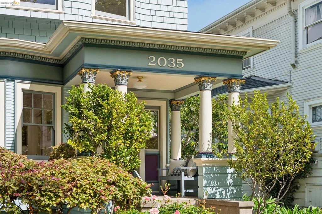 Welcome to 2035 Francisco St, a distinguished Neoclassical Structure of Merit in the heart of North Berkeley’s famed Gourmet District, where world-class dining, beloved cafés and daily conveniences are just steps away. This architecturally rich home offers 5 bedrooms, 2 baths, and a finished attic retreat with sweeping treetop, Bay and City views—an inspiring space for work or reflection. The chef’s kitchen features a 6-burner Wolf range, double oven, Thermador refrigerator and refined finishes, flowing into sunlit living and dining areas designed for comfort and connection. Refinished oak floors, coved ceilings, pocket doors, leaded glass windows and a classic dining fireplace showcase timeless character. French doors open to a generous deck and lush patio ideal for dining al fresco, entertaining or relaxing in a private garden retreat. A detached studio with full bath and soaring pine ceilings offers flexible guest or creative space. Custom exterior paint with pressed gold leaf accents highlights the home’s elegance. Upgrades include newer roof, tankless water heater and heat pump system. Long driveway fits 3–4 cars tandem. Moments to North Shattuck shops, The Cheese Board, Chez Panisse, UC Berkeley and BART. Walkscore – 98. Bikescore - 95. Home Energy Score of 5.