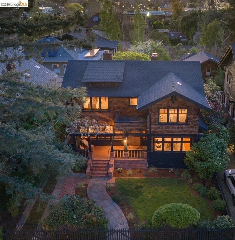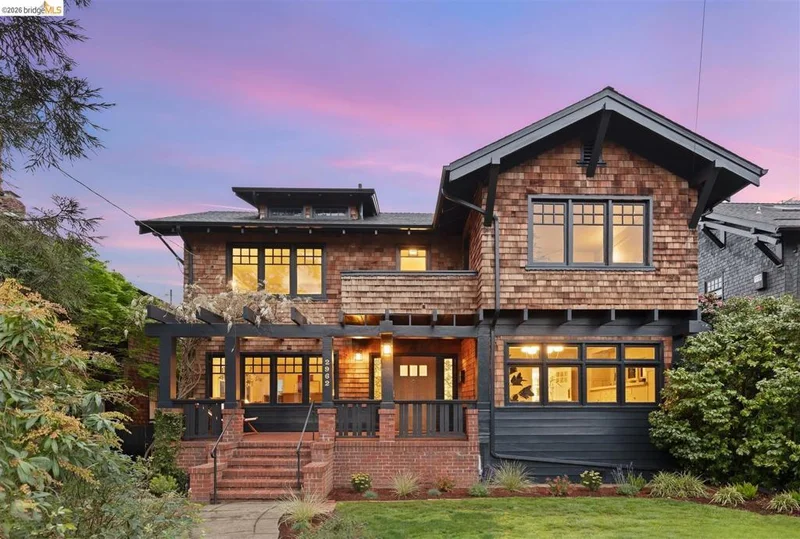 Grand brown shingle in Berkeley’s coveted Elmwood neighborhood, just two blocks from Ashby and College. A charming front yard leads to a stately porch with custom redwood railing and wisteria-draped pergola. A dramatic entry hall with sweeping staircase is framed by pocket doors opening to the living and dining rooms, both featuring rich hardwood floors and exposed beam ceilings. The light-filled, extra-long living room centers around a classic fireplace, while the formal dining room showcases original built-in cabinetry. Original stained glass adorns multiple doors throughout. The updated kitchen offers modern cabinetry, Corian counters, classic Wedgewood, and separate butler’s pantry, plus an eat-in kitchen room overlooking the backyard. A den tucked beneath the stairs and a half bath complete the main floor. Upstairs, the spacious primary suite boasts two walls of windows, large closet and new custom vanity. The second bedroom opens to a second-story deck. An updated hall bath, bonus sunroom* and third bedroom round out the upper level. The private, fenced backyard features a cobblestone patio, mature lemon tree and back deck, while a detached one-car garage offers potential. New roof & gutters, updated foundation, fresh paint inside & out. BESO score 4. *Buyer to investigate.