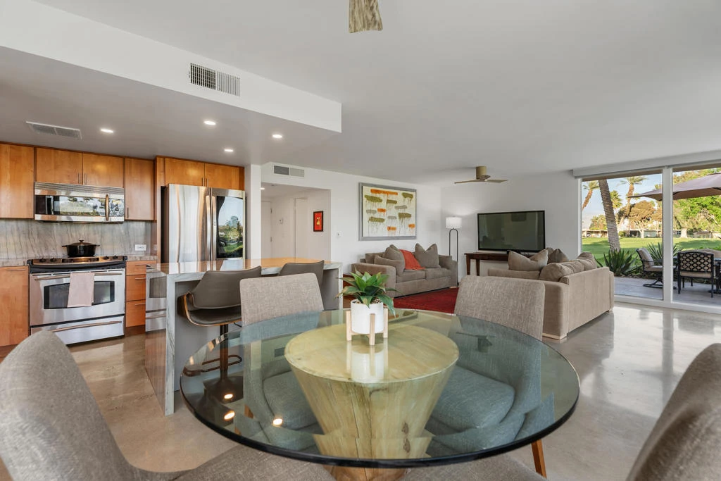 Welcome to the Fairway Villas! Experience classic desert living in this beautifully upgraded mid-century modern 2-bedroom, 2-bath condo located inside the gates of Bermuda Dunes Country Club. Perfectly positioned between #1 and #18 to capture sweeping fairway and mountain views, this stylish residence blends timeless architecture with thoughtful modern upgrades.The open living space showcases polished concrete floors, creating a sleek contemporary feel throughout. The fully remodeled kitchen in 2020 features a luxurious quartz waterfall island and countertops, clean lines, and updated finishes that complement the home's modern aesthetic. Bathrooms upgraded with tiled showers and quartz countertops. New mirrored closet doors, vanities and fixtures were also updated in 2020. Electrical was also upgraded in addition to USB outlets on electrical plugs for convenience!Walls of newly replaced tinted glass windows and sliding doors and screens invite in natural light and frame the stunning golf course scenery, while custom electric blinds provide effortless privacy and comfort at the touch of a button.Whether enjoying morning coffee while watching golfers on the fairway or relaxing with sunset mountain views, this condo offers a low-maintenance desert retreat in one of the valley's most established golf communities.