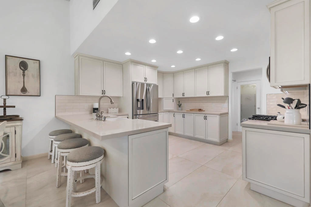Seriously upgraded and remodeled 3 bedroom, 3-1/2 bath home in gated Montego West. This condo has been totally redone: New tile inside and out (travertine); brand new plumbing in 2025; all new showers/fixtures; gourmet kitchen with newer appliances is open to the GREAT ROOM with a stunning fireplace and wood tongue and groove ceiling; and new sliders and shutters throughout. There is nothing to be done here -There are two primary suites, one has an attached office/TV room with a barn door for separation. The third bedroom is a comfortable CASITA with private entrance, A/C and 3/4 bath. All this plus an attached garage for your car and golf cart !! Steps to TWO community pool/spas and tennis/pickleball courts. Montego West HOA is $700 a month and includes the roof, exterior maintenance, gardening & pools, plus tennis & pickleball. The $210 Security dues include cable TV with two boxes with Cinemax/Showtime/HBO and high speed internet with Spectrum. IID for lower electric.