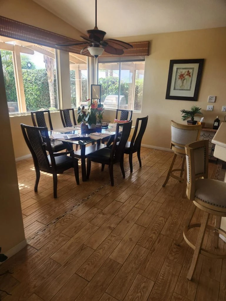 Welcome home to this very spacious, great looking home in Bermuda Dunes at Bermuda Vista's., Located right in the heart of the desert! it's a great location and central to North La Quinta and North Palm Desert services and in such close proximity to shopping, dining, entertainment and the Indian Wells Tennis Gardens, Acrisure Arena and annual recurring events like Stagecoach/Coachella music festivals! So, this beautiful home residence offers a myriad of features that make it a must-see and offers immense value to your home buying choices to consider today for your next home or investment, Calico Glen is tucked away in a nice/quiet Cul-de-sac Street in unincorporated Riverside county and near 10 fwy and Washington and high profile shopping areas, and a multitude of dining options that give in addition, options to recognized accredited schools and all the major Coachella Valley favorite to do's that people from all over the world who come here to enjoy being in such close proximity to all these highly desired destinations that make for great convenience to your daily routine and lifestyle choices around town. This 3bd,2 bath, boasts a very spacious open floor plan, featuring a large family room, living room, with shutters throughout the entire home, with large open kitchen area, and lots of cabinet storage, with a breakfast bar to dine or entertain, as well as a separate dining area with large ample space for room and table for 6-8 people. The large primary master bedroom offers a tranquil retreat complete with renovated master bath, dual vanities and has a custom-built in closet organizer, newly renovated master walk in shower. The 3-car garage amplifies our growing families and need for ample covered parking, that you'll appreciate for cars storage or the driveway, it also provides more ample parking space for you and your guests. Finally, the beautiful patio with covered Aluma wood patio that steps into the backyard where you'll discover an outdoor oasis with a BBQ Island that's featuring a large pool/spa w/ cascading water featuring additionally, lush, mature, landscaping, features plenty of patio space pool area but also boasts majestic mountain views that create lasting memories in a serene and quiet yard that is all for your outdoor enjoyment, I would love to schedule your viewing so that you and your family can contemplate how to make this desert home lifestyle home yours.