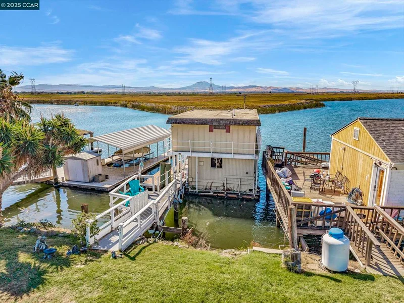 Great investment opportunity! This lot of land has a boat dock and a 1-bedroom, 1.5-bathroom floating home with breathtaking views, making it the perfect spot for a second home or getaway. You'll love the stunning views of Mt. Diablo right from your own place. Plus, there's a spacious storage garage for all your recreational gear, tools, or anything else you need to store. Build your second home on the lot. The floating home has been a vacation rental in the past, so it has great potential for extra income while giving you a fun escape!