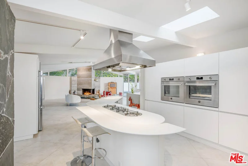 Nestled in the secluded hills of Franklin Canyon, this residence thoughtfully balances mid-century modern architecture with contemporary, material-driven updates. The original structure defined by open volumes, clerestory windows, and expansive walls of glass remains easy to read, while later remodels introduce a textured, organic sensibility that complements the modernist framework. Natural light permeates the open-plan living spaces, reflecting off steel-troweled cement walls and contrasting textures throughout the interiors. A consistent material palette, expressed through the textured fireplace surround, smooth hand-troweled kitchen finishes, and built-in planters, creates a tactile dialogue that bridges eras while preserving architectural clarity. A sculptural concrete and stone fireplace anchors the living room, emphasizing the connection between structure and material. The kitchen, featuring a custom curved island and bespoke cabinetry, serves as a central architectural element, reinforcing the home's focus on flow and craftsmanship. The entire upper level is devoted to the luxurious primary suite, conceived as a serene retreat with a private balcony overlooking the lush, secluded backyard. The suite includes a spa-inspired bath with a cement soaking tub and separate shower, dual closets, and a private water closet with sink. Two guest bedrooms are located on the main level, while a versatile office or glam room on the lower level supports productivity, creativity, or quiet retreat, seamlessly blending function and design. Outdoors, lush palms and hedges ensure exceptional privacy. Built-in concrete benches, framed in the home's original mid-century stone, establish continuity between the front facade and the backyard, while a water feature set within one of the recessed bays provides a serene focal point. Together with a saltwater pool, deck, fire bowl, and intimate lounge areas, these elements extend the modernist ethos seamlessly into the landscape. Situated between Franklin Canyon Park and TreePeople conservation lands, the property offers a rare balance of seclusion and proximity, embodying a home shaped by light, material, and nature.