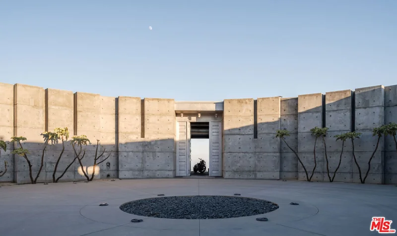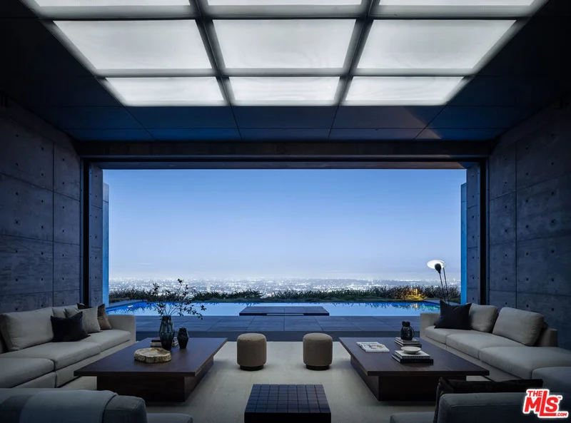 Set at the top of Trousdale, this unparalleled estate is a bold exploration of raw precision, industrial elegance, and sculptural architecture, all while capturing sweeping 180-degree southern views. Designed and built by the acclaimed ID Group, the home centers around a circular motor court enveloped by rhythmic board-formed concrete. Monolithic walls serve as both privacy buffers and dynamic light sculptures, casting dancing shadows from sunrise to dusk. Inside, the architectural intent continues with oversized concrete volumes, perforated metal ceilings, and brushed steel detailing. Framed views of the city and ocean command attention, most dramatically from the main living room, where a retractable glass wall opens to an infinity-edge pool and a horizon that stretches across the Los Angeles skyline. One of the home's most striking features, a fully exposed concept motorcycle, is installed beneath a skylit entry, serving as a dramatic showpiece. Skylights and deep architectural reveals filter daylight through the interiors, creating a constantly shifting interplay of light and shadow. Resort-caliber amenities include a state-of-the-art theater, a spa-inspired primary bath, manicured grounds, walk-in humidor, and meticulously curated one-of-a-kind fixtures. Every element of the home, from its structural form to its bespoke finishes, has been purposefully designed, making 410 Trousdale a truly singular modernist retreat in the heart of Beverly Hills.