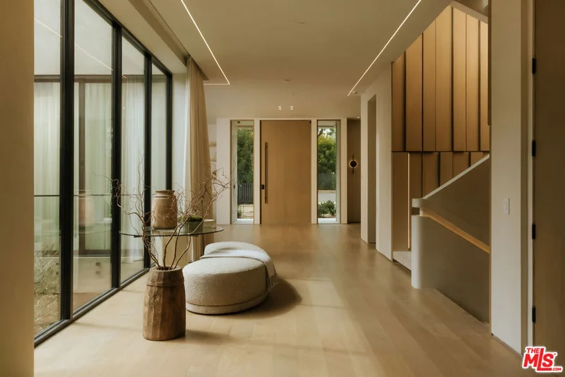 A dual-entry motor court paved in stone sets the stage for arrival, framed by a striking wood-slatted facade and seamless glass balconies that lend the residence its warm modern presence. The approach unfolds with quiet confidence, introducing interiors defined by grand proportions, plastered walls, and meticulously crafted millwork that carries continuity throughout the home. Inside, the main level reveals a sequence of expansive gathering spaces designed for both scale and intimacy. A formal living room wrapped entirely in floor-to-ceiling glass draws natural light deep into the home, while the adjacent dining room connects discreetly to the chef's kitchen. Here, bespoke stone walls and countertops meet custom oak cabinetry, anchored by two dramatic waterfall islands that serve as both workspace and social centerpiece. Wolf, Miele, and Sub-Zero appliances integrate seamlessly within the design, while a casual dining area sits just beyond. The kitchen transitions effortlessly into a generous family room centered around a ribbed-detail fireplace, with towering pocket glass doors dissolving the boundary between interior living and the surrounding grounds. A sculptural staircase elegantly curved and extending across three floors acts as a visual anchor, its glass ceiling above filtering daylight downward, while an elevator provides effortless access to every level. Above, a library-style lounge at the landing connects the primary suite with three additional bedroom suites, each offering walk-in closets and beautifully appointed baths, with the largest featuring a private patio overlooking Alpine. The primary suite serves as a peaceful retreat with a ribbed fireplace and a covered wraparound terrace. Its boutique-style dressing room leads to a marble bathroom with dual vanities, soaking tub, and oversized rainfall shower, where glass walls open directly to the terrace and backyard beyond. The lower level unfolds around a dramatic double-height glass courtyard, where a living olive tree rises beside a vertical green wall to create a serene natural centerpiece. Arranged around this space are a series of gathering and lifestyle areas including a large lounge with billiards, a marble bar with dual wine refrigerators, and a dedicated theater. A private office and library open to their own patio for quiet work or reading, while wellness amenities include a fitness studio, sauna, and steam room. This floor also accommodates a guest bedroom with walk-in closet and en-suite bath sharing the library patio, along with a laundry room and three full bathrooms. Outdoors, a long covered patio with integrated heating and an outdoor kitchen anchors the grounds, complemented by a pool, spa, outdoor shower, and multiple lounge areas designed for relaxed entertaining. Located within the Beverly Hills Flats, the residence places the city's most celebrated shopping, dining, and cultural destinations just minutes away, along with access to top-rated schools and community amenities.