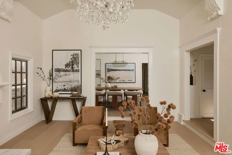 Set behind gates on a coveted residential block south of Burton Way in Beverly Hills, this 1931 Spanish jewel box combines timeless architecture with thoughtful modern refinement. Lush landscaping and a private garden courtyard create a gracious arrival, and the home's facade displays rich architectural texture, original detailing, and beautifully preserved period character. The block is known for its established residential character while remaining closely connected to the heart of Beverly Hills. The home preserves the scale, proportion, and character that define Spanish homes of this era. Inside, the dramatic living room is defined by well-proportioned scale and soaring faceted ceilings accented by original plaster crown moldings and sculptural corbel detailing. A statement fireplace anchors the space, while a large arched picture window frames the garden beyond and reinforces the symmetry. Natural light moves gracefully through the interior throughout the day, while the design balances the home's Spanish heritage with a refined modern interpretation. The dining room and kitchen connect naturally, creating an easy flow for everyday living and informal gatherings. Bedrooms are generously proportioned, including two en suite, and a separate office provides additional space for work or study. Bathrooms have been thoughtfully updated with timeless materials and sophisticated modern fixtures. Outdoor spaces extend naturally from the home, highlighted by a significant stainless steel outdoor kitchen and chef's center designed for outdoor dining and entertaining. Adjacent to the yard, a detached bonus space currently serves as a family play area and offers flexible space for a variety of uses. Ideally positioned within close reach of the Beverly Hills Triangle, the home offers classic architecture with effortless access to the best of Beverly Hills dining and shopping. A 1931 Spanish jewel box in one of Beverly Hills' most desirable residential pockets.