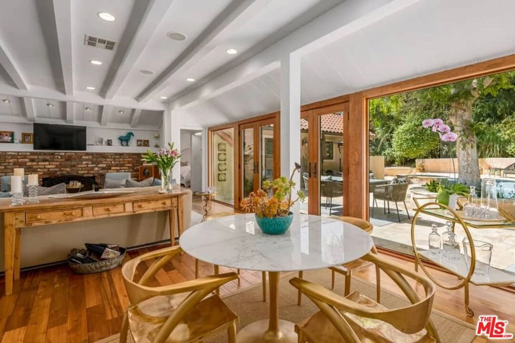 Nestled on a quiet cul de sac in Beverly Hills, this exceptional Spanish Contemporary 3 bedroom plus office/den (convertible to 4th BR) was custom designed and offers a flexible and easy floor plan beautifully integrating the indoor/outdoor living concept. The entry with high ceilings opens to a spacious living-dining area with a handsome brick fireplace, beamed ceilings and French doors opening to a tranquil, private backyard patio, pool and spa surrounded by mature, lush greenery. The enormous high quality chef's kitchen features travertine flooring, high ceilings, a huge center island, Kitchen Aid stainless appliances with oversized fridge, sizable pantry and direct access to a well organized garage. The lovely primary suite has pitched, beamed ceilings, a luxe bath, and an oversized walk-in closet. The secondary suite is also substantial with large bath and walk-in closet. A cozy den/office completes the downstairs. The upstairs suite is perfect for a gym or guest room. This home is in beautiful condition and is flooded with natural light, and offers green views from every room. There are hardwood floors throughout and closets and storage galore! Other amenities include 3 zone HVAC, surround sound system, and security system.