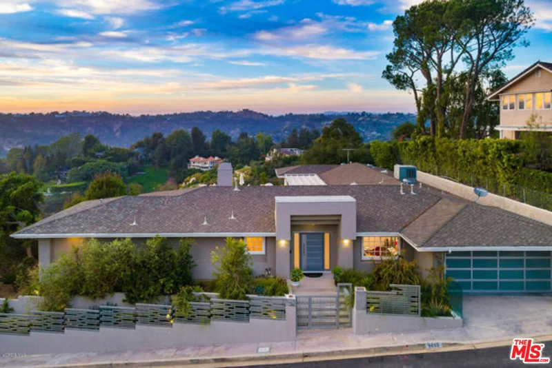 CAN'T HELP FALLING IN LOVE~ Come And Make this Elvis Presley 1960's 70's Retreat Your Forever Home!!! Stunning One-Story Mid-Century Retreat with Spectacular Views! Located on a quiet, private cul-de-sac just 10 minutes from Rodeo Drive. This fully gated mid-century home offers exceptional privacy, tranquility, and effortless indoor/outdoor living. Thoughtfully remodeled inside and out, the residence showcases refined design elements, impeccable craftsmanship, and panoramic canyon views from nearly every room. A formal entry leads to an expansive coffered living room with a fireplace and seamless access to the outdoor terrace. The modern chef's kitchen equipped with professional-grade appliances features a bright breakfast area and opens to the formal dining room with an impressive 11-foot pitched ceiling and custom marble decorative shelving. Walls of glass throughout the home flood the interiors with natural light and open directly to the terrace, creating an ideal setting for entertaining. Property offers TWO luxurious PRIMARY SUITES situated on opposite ends of the home for ultimate privacy. One includes a generous sitting room, while the other features dual walk-in closets. Both suites offer spa-like bathrooms, ample storage, and serene canyon views. A third guest or family suite with its own bath and a separate office complete the versatile interior layout. Additional features include:* Newly designed architectural entry gates and front door* Beautiful hardwood floors and recessed lighting* 8-camera security system and indoor/outdoor sound system* Two-car garage plus under-house storage. This home was thoughtfully designed and constructed on Caissons, providing a deep engineered foundation designed for long-term stability and peace of mind. Outside, an expansive terrace overlooks the canyons and features a heated swimming pool and hot tub perfect for relaxing or hosting gatherings in a serene, private setting. This exceptional property combines mid-century charm, modern luxury, and breathtaking views in one of the most desirable Beverly Hills- Post location.