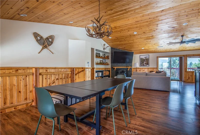 Southern exposure and ski slope views define this spacious custom log-style home in Whispering Forest. Built in 2007, the property combines scale, quality construction, and thoughtful updates in one of Big Bear’s most desirable neighborhoods. Designed with a reverse floor plan, the upper level showcases vaulted tongue and groove ceilings, expansive windows, and an open great room that captures natural light and mountain views. The living area centers around a fireplace and built-ins, while the adjacent dining space and entertainer’s kitchen flow seamlessly together. The remodeled kitchen features abundant counter space, dual islands with extra wash sink and breakfast bar seating, updated cabinetry, and a layout ideal for hosting gatherings. The primary suite is also located on the upper level and offers its own fireplace, deck access, and a spacious bath with dual vanity, soaking tub, and separate shower. Downstairs, additional bedrooms, bathrooms, and a family room provide excellent separation and flexibility for guests or extended stays. Outdoor living is a true highlight, with a long covered deck framing mountain and ski slope views and creating a natural extension of the main living space. The fenced yard includes a private hot tub and fire pit area, while the lower deck offers additional access to the backyard. Situated on a 10,710 square foot corner lot with level topography, the property provides generous parking, and a two-car attached garage. The garage is currently utilized as a finished recreation space, offering added versatility. An EV charger and recently installed HVAC system add modern convenience and year round comfort. Located just minutes from the National Forest, ski resorts, the lake, grocery stores, and dining, this home offers strong full time livability and proven short term rental appeal.