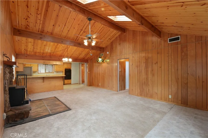 Welcome to this charming single-level mountain retreat in Big Bear City, set on an expansive lot surrounded by mature trees and outdoor living spaces. This well-maintained 2-bedroom, 1¾-bath single-family home offers comfort, character, and flexibility—ideal as a full-time residence, weekend getaway, or investment opportunity. Both bedrooms feature ensuite bathrooms, providing privacy and convenience. The living room is warm and inviting with tongue-and-groove pine, skylights, a ceiling fan, and a recently installed fireplace insert for cozy mountain evenings. A swamp cooler helps keep things comfortable in warmer months, and the included wood rack adds both function and rustic charm. The kitchen blends vintage appeal with modern updates, featuring classic cabinetry, a breakfast bar, built-in cooktop, oven/broiler, new stainless-steel dishwasher, and a newer stainless-steel refrigerator. Indoor-outdoor living shines here. An 8-foot sliding glass door opens to a beautiful redwood porch, perfect for relaxing or entertaining. The primary suite includes access to an enclosed patio with a wall heater, which also houses washer/dryer hookups with a gas connection. The rear patio features durable Trex decking, and the property is enhanced by apple, apricot, and pear trees, along with a stately blue spruce. Additional exterior highlights include a 2-car garage with two doors, gas and water already run to the garage, offering a potential ADU conversion (Buyer to verify with local authorities.), and a wood/garden shed with a concrete floor. With its generous lot size, thoughtful updates, and mountain character, this Big Bear City home offers a rare combination of comfort, charm, and future potential.