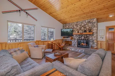 Welcome to your dream retreat in Moonridge! This turnkey home offers the perfect blend of rustic charm and with a modern stylistic touch. Nestled in a peaceful alpine setting, this ideal escape features 3 bedrooms, including a spacious master suite, and 2 baths. As you step inside, you're greeted by vaulted cedar-lined ceilings and a cozy river rock fireplace, creating a warm and inviting atmosphere. Tasteful updated flooring throughout and don't miss the expansive decking with a new spa that allows you to soak in the mountain air among the pines. With a spacious 2-car garage, complete with an added game room, you'll have plenty of space for storage and entertainment. Whether you're looking for a serene getaway or an investment opportunity as a successful Airbnb, this property offers it all. Don't miss out on the chance to own your own piece of paradise!