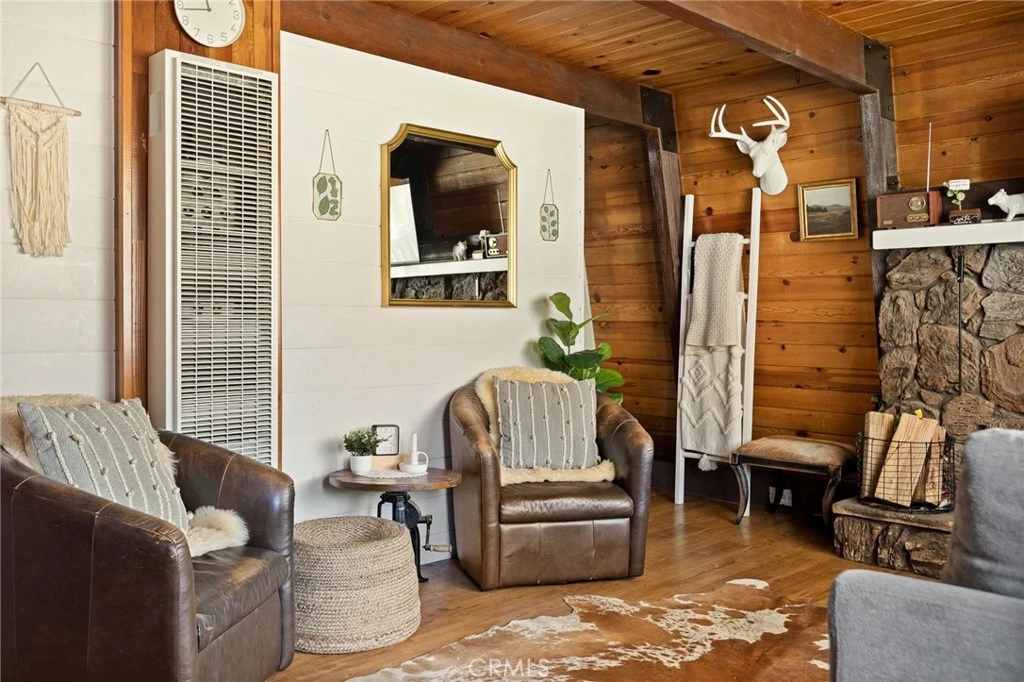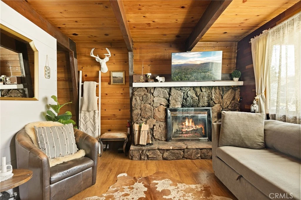 Escape to the mountains in this charming gambrel barn-style home, partially furnished and move-in ready. This cozy 2-bedroom, 1-bath retreat features a stone wood-burning fireplace, an upgraded kitchen with rugged granite countertops, newer stainless steel appliances, and farmhouse-modern touches. Other updates include a newer roof and dual-pane windows. Two spacious bedrooms provide plenty of room for guests, making it perfect for a vacation or income-producing rental. Relax on the inviting front porch with your morning coffee, or unwind on the balcony while taking in stunning snow-capped mountain views. Enjoy the added convenience of flat streets and a level driveway—ideal for easy access and parking during snowy seasons. Just munutes from Big Bear Lake, the village, and ski resorts, this home combines comfort, style, and convenience for the ultimate mountain getaway or investment opportunity