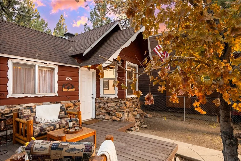 Welcome to this charming 1920s Maltby cabin nestled among the towering pines of Big Bear, where vintage mountain character meets thoughtful modern updates. This authentic retreat features a welcoming living room with a stunning native rock Lodi fireplace, vaulted wood-beam ceilings, classic shiplap wood paneling, and wood-look flooring that create the quintessential mountain cabin ambiance. Natural light fills the dining nook with tranquil forest views, while the updated vintage-style kitchen offers quartz countertops, breakfast bar seating, generous window light, and updated appliances. The main-level bedroom provides a peaceful retreat with mirrored wardrobe closet and scenic tree views, complemented by an updated bathroom featuring a newer shower surround and oil-rubbed bronze fixtures accented by charming exposed steampunk-style copper plumbing. Upstairs, a rustic loft bedroom with wood plank walls and ceilings overlooks the fireplace hearth and includes a skylight framing treetop views, snowfall, and starlit skies. Recent upgrades include new copper plumbing and exterior heat tape for winter comfort. Outdoor spaces include a front wood deck, level driveway, fully fenced yard, and storage shed, ideal for relaxing or entertaining after a day of mountain adventure. Conveniently located near Bear Mountain Ski Resort, hiking trails, Big Bear Lake recreation, dining, and year-round outdoor activities, this classic Maltby cabin offers a rare opportunity to own a quintessential Big Bear mountain retreat.