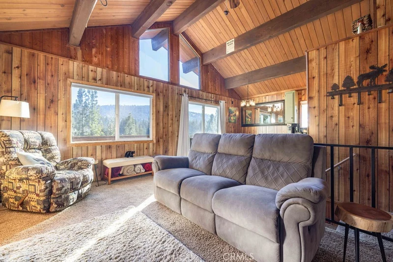 Assumable loan opportunity at 2.875% interest rate for qualified buyers, subject to lender approval. Prime Moonridge location with a south-facing orientation and easy access to the paved pathway, Bear Mountain Ski Resort, the golf course, Alpine Zoo, scenic forest hiking and biking trails, plus local favorites like Moonridge Coffee and Dank Donuts. This stylish mountain home delivers both lifestyle and convenience. The reverse floor plan places the main living space upstairs, where vaulted wood-beamed ceilings and expansive windows bring in natural light and capture mountain and treetop views. A striking rock fireplace anchors the living room, while the kitchen and dining area flow comfortably for everyday living or hosting guests. A balcony just off the living and dining space extends entertaining outdoors and benefits from consistent sunshine throughout the day, along with easier winter snow melt thanks to the south-facing orientation. A bathroom is also conveniently located on this upper level. Downstairs, both bedrooms, a second bathroom, and laundry are positioned off the entry level, offering privacy and functionality. A dedicated mudroom with direct backyard access adds everyday practicality, and additional access from upstairs enhances indoor and outdoor flow. Multiple decks, a private hot tub with expansive sky views, and a flat, usable backyard create inviting outdoor space ideal for yard games, entertaining, or relaxing among the pines. Enjoy elevated, treehouse-like views while still benefiting from convenient access and parking. Whether you are searching for a vacation home, short-term rental investment opportunity, or full-time mountain residence, this property offers flexibility in one of Big Bear’s most established neighborhoods. Approximately 2.5 hours from Los Angeles, Orange County, and San Diego, weekend mountain escapes are simple and within easy reach.
