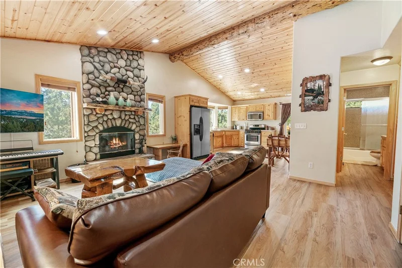 INVESTOR & VALUE-ADD OPPORTUNITY — EXPANDABLE MOUNTAIN RETREAT Meticulously maintained custom-built home (2004) offering alpine charm, panoramic views, and exceptional expansion potential. The main level features 4 bedrooms, 3 baths, soaring vaulted ceilings with exposed beams, and an open-concept living area filled with natural light. The expansive elevated deck captures sweeping views of surrounding hills and National Forest — perfect for year-round enjoyment. A private ~400 sq. ft. guest suite with separate exterior entrance offers flexibility for multi-generational living or income potential. BONUS: The lower level includes an unfinished space approximately equal in size to the main living area — providing incredible value-add opportunity. Ideal for future expansion into additional bedrooms, a game room, home theater, gym, second living unit (buyer to verify), or creative custom design. Whether you’re seeking a primary residence, vacation home, or high-upside investment, this property delivers immediate enjoyment with room to grow. Now attractively positioned — rare chance to secure space, views, and future equity in Big Bear Lake.