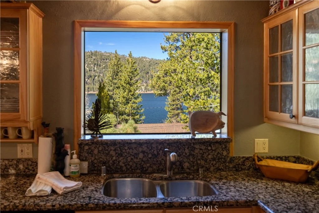 This Big Bear Lake West retreat offers a classic cabin feel with a prime elevation for rare, dramatic views of the lake and mountains. The interior features vaulted wood-beamed ceilings, a floor-to-ceiling stone fireplace, and a 30' great room with massive wall of glass that fills the space with natural light. With four spacious bedrooms, a kids' loft, and brand-new hot tub, the property is perfectly configured for either a high-occupancy short-term rental or spacious family retreat. The indoor-outdoor living is fantastic, featuring a 500 sf deck with grill, firepit and separate spaces for relaxing and dining. The home’s layout is designed for effortless entertaining, featuring a large formal dining area, eat-in kitchen with lake views, and a game area with custom wet bar. Outside, the large horseshoe driveway comfortably parks five cars, and is complemented by an oversized one-car garage that doubles as a secondary game room. Located in an ultra-quiet, premier neighborhood, you are just minutes from the iconic Castle Rock Trail and other scenic hiking paths. Residents enjoy easy access to Boulder Bay and nearby lake entry points perfect for launching a canoe or kayak. Offered fully furnished and move-in ready, this home provides a unique vantage point in one of the mountain's most desirable areas.