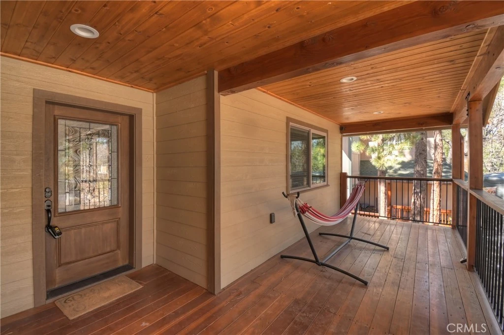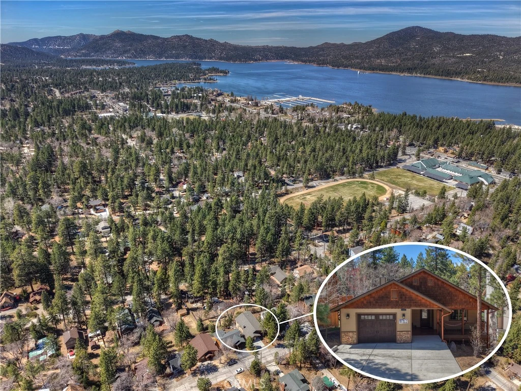 Stunning 2019 built, single story, level entry, mountain retreat in a prime central Big Bear Lake location ~ Experience refined mountain living in this exceptional custom-built home ~ It's had one loving owner and is ideally situated close to the top of a street that ends at the access to Town Trail and other Snow Summit trails, is just minutes from the ski slopes, Big Bear Lake, and walking distance to the Village ~ Featuring 1,613 square feet of open, light and bright living space, this home has 3 bedrooms and 2 bathrooms, and is thoughtfully designed with high-end finishes ~ The expansive great room showcases soaring vaulted Alderwood ceilings, rich engineered hardwood flooring, and an impressive floor-to-ceiling rock fireplace—creating a warm gathering space ~ The large kitchen is both elegant and functional, appointed with granite countertops with a live edge, large center island with lots of cabinets, custom Alderwood cabinetry, and stainless steel appliances, even has a dishwasher ~ It's perfect for entertaining or quiet evenings at home ~ The primary suite offers a slider out to the deck, large closet and ceiling fan ~ The master bath has double sinks, a beautifully tiled walk-in shower featuring a flat pebble stone floor and granite accents, and more gorgeous Alderwood cabinets ~ Step outside to enjoy the serene mountain setting from the covered front porch or the private rear deck, both redwood with wrought iron accents—ideal for entertaining beneath the pines ~ This home offers year-round recreation and luxury mountain living at its finest ~ Additional amenities include a tankless water heater, fully finished insulated garage with electric vehicle charging capability, and a striking exterior of low-maintenance siding accented by stone and shake detailing ~ This comfortable and solid home would make a wonderful primary residence or vacation home, and with its exceptional location and layout, it has a lot of short term rental potential.