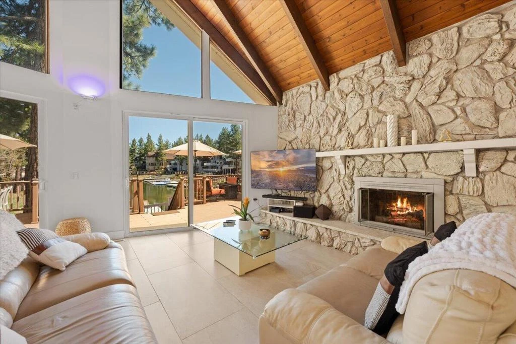 Discover the perfect blend of classic A-frame woodwork and modern upgrades in this beautifully updated lakefront home with boat dock privileges. Located along the protected waters of Mallard Lagoon, the serene setting offers a sheltered site that is ideal for safely launching a kayak or boat and also attracts a variety of ducks, stellar's jays, blue heron, and eagles. Step inside to find a fully renovated interior featuring new large-format porcelain floors throughout, fresh drywall, recessed lighting, and a completely updated kitchen with bright quartz countertops, farmhouse sink, and high-end appliances including a Bosch dishwasher, gas stove, refrigerator, microwave, and garbage disposal. Both bathrooms have been refreshed, including a fully rebuilt upstairs shower constructed using a floated custom tile--considered a premium method for durability and craftsmanship. Modern artwork throughout is brought to life by new recessed lighting and eye-catching fixtures. Comfort is enhanced with a large gas fireplace, new tankless water heater, mini-split AC upstairs, and a fully updated central heating system. The home also features new washer/dryer, updated closets, and stylish furnishings including memory foam beds, reinforced frames, leather sofas, and designer dining chairs. Outdoor living is equally impressive with a spacious deck equipped with BBQ, full-size dining table, and fire pit seating area. Soak in the brand-new Artesian Captiva 33 WiFi-enabled spa, or sun on the expansive newly-built lower patio. The home features a stone path to the dock with dock light, and on the other side a fully fenced yard with motorized entry gate, fruiting trees (apples, pears, peaches, and apricots), in-ground electrical, irrigation improvements, boat parking pad, and EV charging outlet. The exterior has also been freshly repainted and the driveway resealed. This move-in-ready lakefront home seamlessly combines comfort, quality upgrades, and an incredible waterfront lifestyle--perfect for full-time living, weekend escapes, or entertaining by the lake. It is currently vacation-rental approved by the City and has been operating as a second home, supplemented by high-quality rentalincome, for five years.