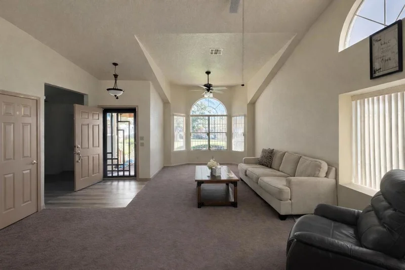 Discover the perfect blend of modern elegance and relaxed living in this stunning home. This bright, airy home boasts soaring vaulted ceilings and an open floor plan that seamlessly flows from the spacious living room to the inviting dining area. A stunning double-sided fireplace effortlessly sets the mood, warming both spaces with its charm. The kitchen, equipped with modern appliances and generous counter space, is perfect for both everyday meals and entertaining. The master suite offers a serene escape with a walk-in shower, while the second bathroom features sleek, contemporary finishes. For added fun, a spacious game room awaits your entertainment. Outside, the beautifully manicured front yard and shaded lawn provide the ideal setting for relaxing or entertaining guests. With both style and functionality, this home is a true gem. Don't miss the chance to make it yours.