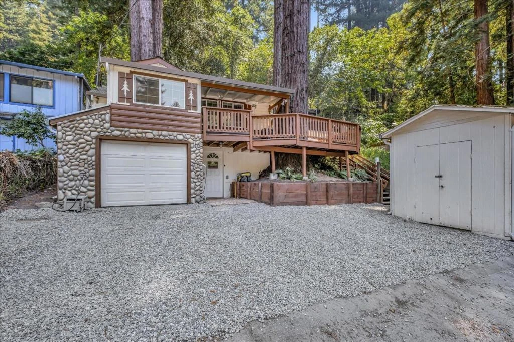 This wonderful Boulder Creek cottage pays homage to the beauty & serenity that the Santa Cruz Mountains has to offer! Set back from Hwy 9 you'll have plenty of parking & be pleased w/ the close proximity to the Sawmill Restaurant/Ale House or fine dining at Scopazzi's. The moment you walk in the front door, vaulted ceilings will catch your eye! Amenities include; an updated kitchen w/ stainless steel gas stove & oven, an over the range microwave, dishwasher & granite countertops, In addition you'll enjoy the updated and trendy bathroom w/ glass shower doors, wainscoting & tiled walls in the tub area. French doors lead out to the deck from one of the bedrooms. Bonus room, can be used as an office, or extra bedroom. This home boasts a heat pump A/C unit in primary bedroom, a generator & level 2 EV charger. Approx. 30 minutes to Santa Cruz beaches or a 35 minute drive to Silicon Valley. Don't miss this treasure, come take a look for yourself!