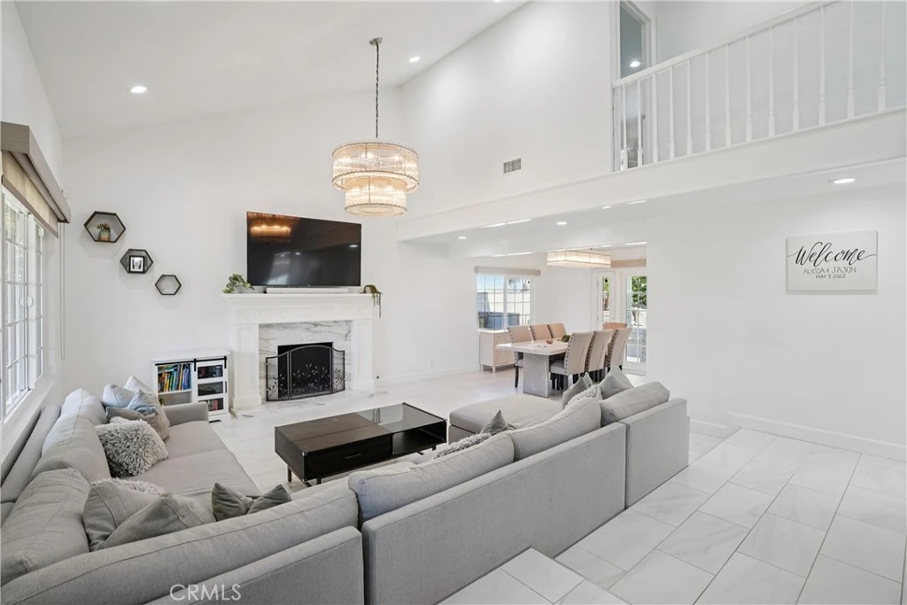 Beautifully appointed home nestled in the prestigious North Hills community, showcasing refined finishes and abundant natural light throughout. The open-concept living room is highlighted by tile flooring, soaring vaulted ceilings, recessed lighting, a gas fireplace, and a dramatic picture window that floods the space with sunlight. The living area flows seamlessly into the dining room, which offers serene views of the lush backyard—perfect for both everyday living and elegant entertaining. The upgraded kitchen is a chef’s delight, featuring stainless steel appliances, a gas cooktop, marble countertops, recessed lighting, wine refrigerator, and generous cabinetry. The kitchen opens effortlessly to the casual dining area and family room, creating an inviting and functional gathering space. A downstairs bedroom has been thoughtfully opened to expand the family room, enhancing the home’s open and airy feel. Upstairs, the luxurious primary suite is a true retreat, complete with a private balcony overlooking mature trees and the spacious backyard. The suite boasts vaulted ceilings, recessed lighting, a walk-in closet, and a spa-inspired bath featuring a separate soaking tub, custom vanity, and an oversized walk-in shower. Two additional generously sized bedrooms and a full bath complete the upper level, including a charming children’s room enhanced by a custom-painted mural, adding a unique and whimsical touch. Home also boasts a full remodel of the kitchen, bathrooms, bedrooms, carpet, and patio. The private backyard is an entertainer’s dream, offering a sparkling pool and spa, covered patio, sport court, and lush landscaping—ideal for gatherings, summer BBQs, and relaxed outdoor living. Community amenities include a playground, pool, and clubhouse. Located within the award-winning Brea Olinda Unified School District and just minutes from Brea Mall, Downtown Brea, dining, and entertainment.