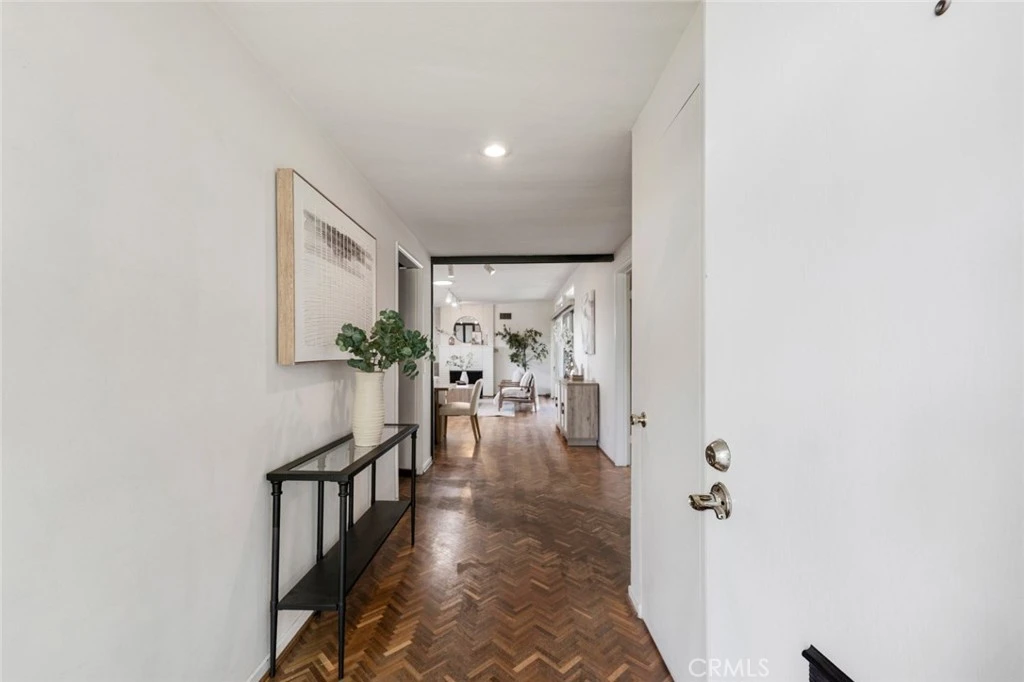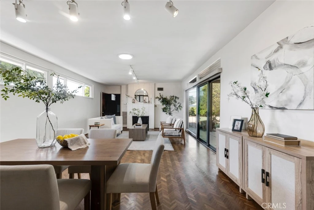 Situated on an expansive corner lot of over 11,000 sq ft, this beautifully maintained mid-century modern home offers timeless character and access to highly regarded public schools including Thomas Jefferson Elementary, John Muir Middle, & Burbank High. Manicured landscaping and a covered front porch welcome you to 2,404 sq ft home with 5 bedrooms & 2.5 bathrooms, highlighted by herringbone parquet wood flooring throughout and new carpeting in bedrooms & formal living room. The open-concept dining & family room feature a centered fireplace, abundant natural light from a floor-to-ceiling picture window, and sliding glass doors to the large covered backyard patio. A sliding wall panel reveals the galley-style kitchen with wall oven, built-in electric cooktop, a window facing the front yard, and side access to a private enclosed patio with two storage sheds. The first bedroom, just off the family room, offers an en-suite powder bath and exterior doors to both the side patio & backyard. The formal living room also enjoys natural light from two solar tubes and a sliding glass door to the backyard patio. A central hallway leads to 4 additional bedrooms and 2 updated bathrooms with travertine surrounds, mosaic tile floors, & stone countertops—one with an oversized walk-in shower, the other with a separate tub & shower with high-end hardware. One rear bedroom has a built-in dresser and sliding glass door to the backyard patio, while the adjacent bedroom has dual closets and a built-in vanity—easily convertible to a wet bar. The covered backyard patio boasts a wood ceiling with fan & track lighting, opening to a lush lawn and wood deck leading to a brick patio with above-ground hot tub. Beyond, a sprawling brick & concrete entertaining area, previously used as a badminton court with lighting, surrounded by mature foliage and fruit trees—including meyer lemon, navel orange and haas avocado—offers space for gatherings and potential for a future already plumbed in-ground pool or ADU. Additional highlights include a laundry room, 2-car attached garage, dual-zoned HVAC with one of the two units replaced in 2023, and new roof completed in 2025. Ideally located near McCambridge Park, vibrant Burbank shopping, dining, and studios, and convenient commuter routes throughout the highly sought after Burbank Hills area.