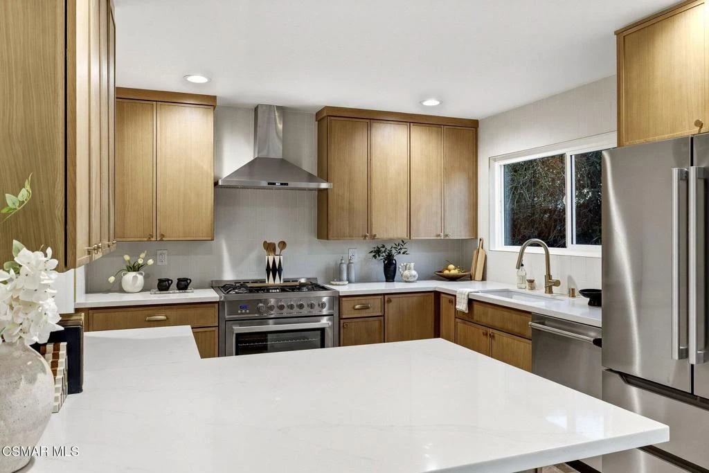 Welcome to this stunning, permitted now as 4-bedroom, 3-bathroom home in the heart of Calabasas, where modern design meets effortless California living. Thoughtfully reimagined from top to bottom, this turnkey residence showcases high-end finishes, open-concept living, and a beautifully upgraded backyard oasis.Step inside to discover brand-new wide-plank flooring, fresh interior finishes, and an abundance of natural light pouring through all-new windows. The completely remodeled kitchen is the centerpiece of the home, featuring custom cabinetry, sleek quartz countertops, stainless steel appliances, and a spacious island with seating--perfect for everyday living and entertaining alike. The kitchen flows seamlessly into the dining and living areas, creating a bright, open layout ideal for gatherings.All three bathrooms have been fully renovated with designer tile, custom vanities, modern fixtures, and spa-inspired details. The spacious primary suite offers a serene retreat with a beautifully updated en-suite bath and generous closet space. With four well-appointed bedrooms, the home provides flexibility for families, guests, or a dedicated office space.Step outside to your private backyard escape. The pool has been resurfaced and enhanced with a new pool heater, creating the perfect setting for year-round enjoyment. Surrounded by mature landscaping and open sky views, the outdoor space is designed for both relaxation and entertaining.
